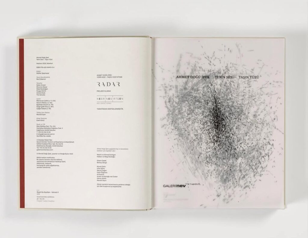 Ahmet Doğu İpek’in sanatçı monografisi “Sound of the Ground – Face of the Stone” / “Yerin Sesi – Taşın Yüzü” iki yıllık bir çalışmanın ardından Mousse Publishing ve Galeri Nev İstanbul tarafından yayımlandı. Editörlüğünü Nilüfer Şaşmazer’in, tasarımını Esen Karol’un üstlendiği yayında, Sibel Bozdoğan, Shumon Basar, Duygu Demir, Ariane Koek ve Tilo Schulz’un bu kitap için kaleme aldığı yeni metinlerin yanı sıra Selen Ansen’in bir şiiri yer alıyor. İngilizce edisyonu Mousse Publishing, Türkçe edisyonu Galeri Nev İstanbul tarafından yayımlanan kitap, ilk olarak Tate Modern, Londra’da Frieze London açılış haftasında gerçekleşen lansmanla tanıtıldı. Kitabın ikinci lansmanı ise İstanbul’da Kasım ayında gerçekleşti.