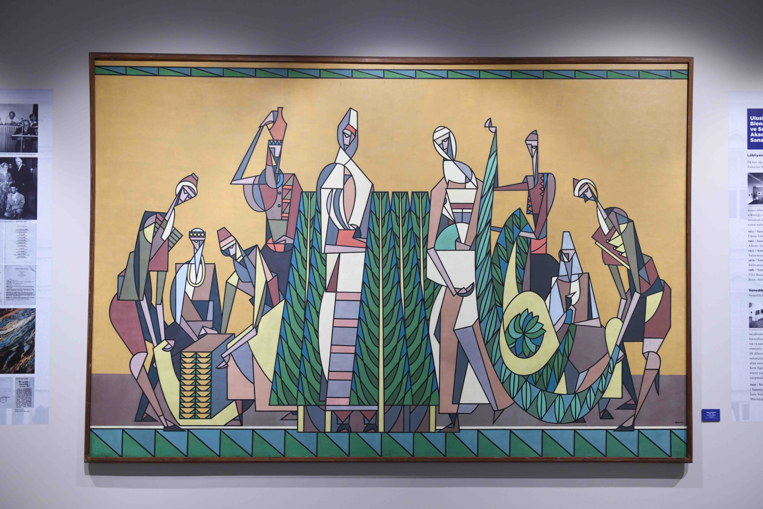 Panelin bu alanına refakat eden bir diğer orijinal koleksiyon yapıtı ise, Sabri Fettah Berkel’in geometrik soyutlamacı Tütün Toplayanlar’ı olurken, serginin paylaştığı bir diğer konu başlığında “Uluslararası Bienallerde ve Sergilerde Akademili Sanatçılar” masaya yatırılıyor. Sanatçıların Venedik Bienali başta olmak üzere, Llyibliana Grafik Sanatlar Bienali veya Sao Paulo Bienali’ne katılmış imza ve yapıtları sıralanıyor. Kuşkusuz, serginin en ilginç keşiflerinden birini İlhan Koman’ın tasarladığı soyut kompozisyon Portmanto oluştururken, etkinlikte Mehmet Güleryüz’e ait erken dönem bir MSGSÜ İRHM koleksiyonu parçası, soyut kompozisyon da not edilen çalışmalar arasına giriyor. Özgünbaskı sanatı ve Akademi bereketini de sergileyen etkinlikte bu kapsamda, Neş’e Erdok, Oktay Anılanmert, Ömer Kaleşi, Cihat Aral, Mehmet Güleryüz, Utku Varlık, Nur Koçak ve Nevhiz ile Alaettin Aksoy’un da bu alandaki soyutlamaları kayda alınıyor.