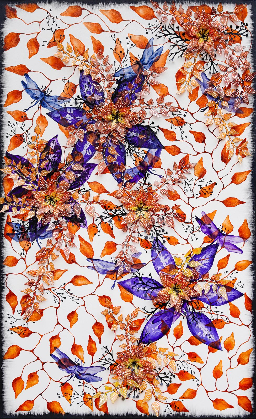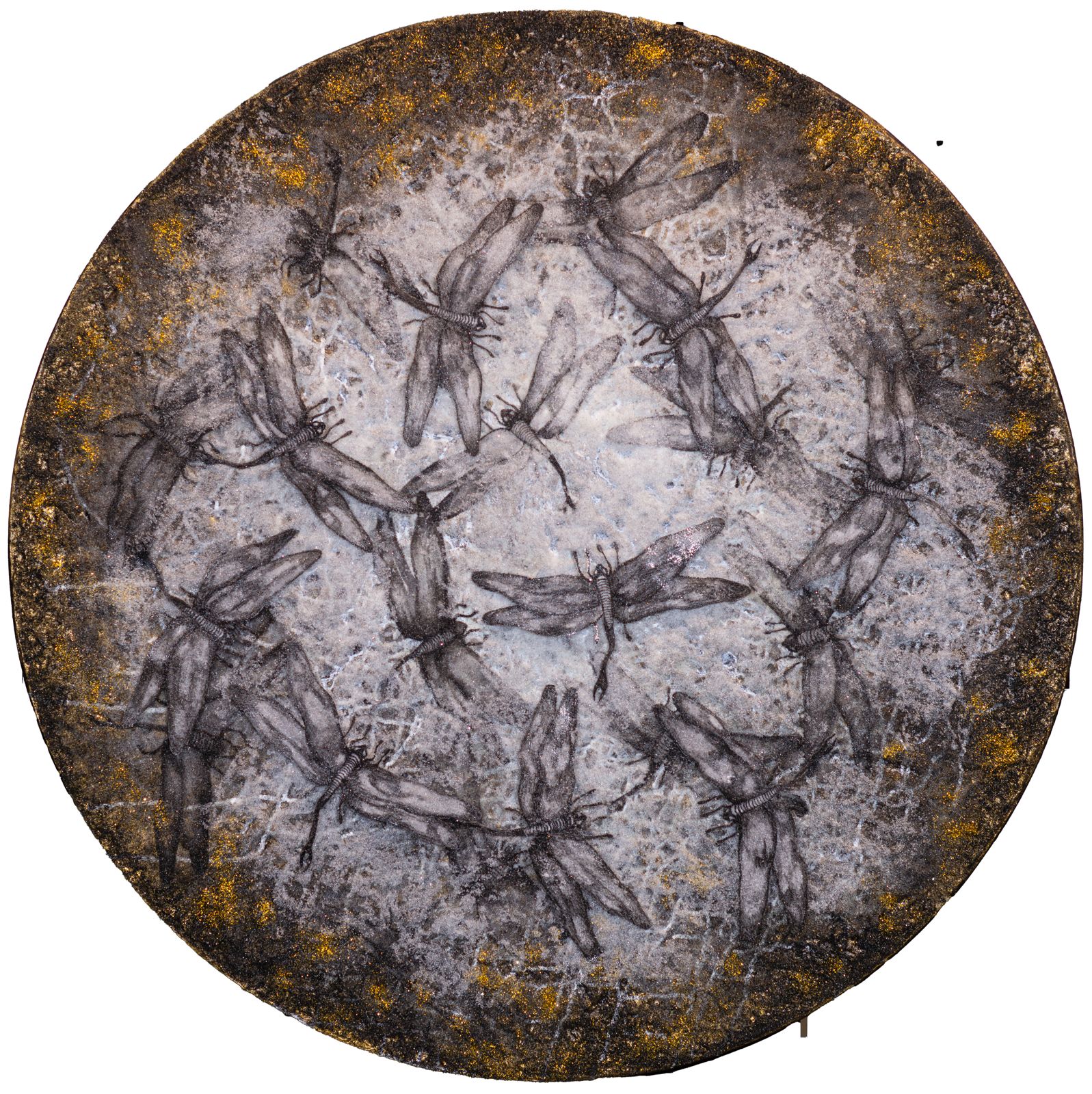 Elvan Alpay: Sanırım çoğu işimin resimle heykel arasında durduğunu söylemek çok abartılı olmayacaktır. 1993’te açtığım Büyüklere Masallar sergisi, devasa muz, kiraz ve üzümler üzerine konmuş rengarenk oyuncak kurbağalardan oluşuyordu. Sonrasında alüminyum ve ayna dökümler yaptım, cam ve paslanmaz çelik, epoksi, alçı, ahşap hamuru ve farklı bir çok malzemeyi tual yüzeyine boyut kazandırmakta kullandım. Temel çalışma pratiğim olan çoğaltma ve bir araya getirme  seneler içerisinde bir çok farklı malzeme ile evrildi. 2013 Biophilia sergisi, tual zemininin sakin, tek boyutlu olduğunu hatırladığım tek sergimdir.