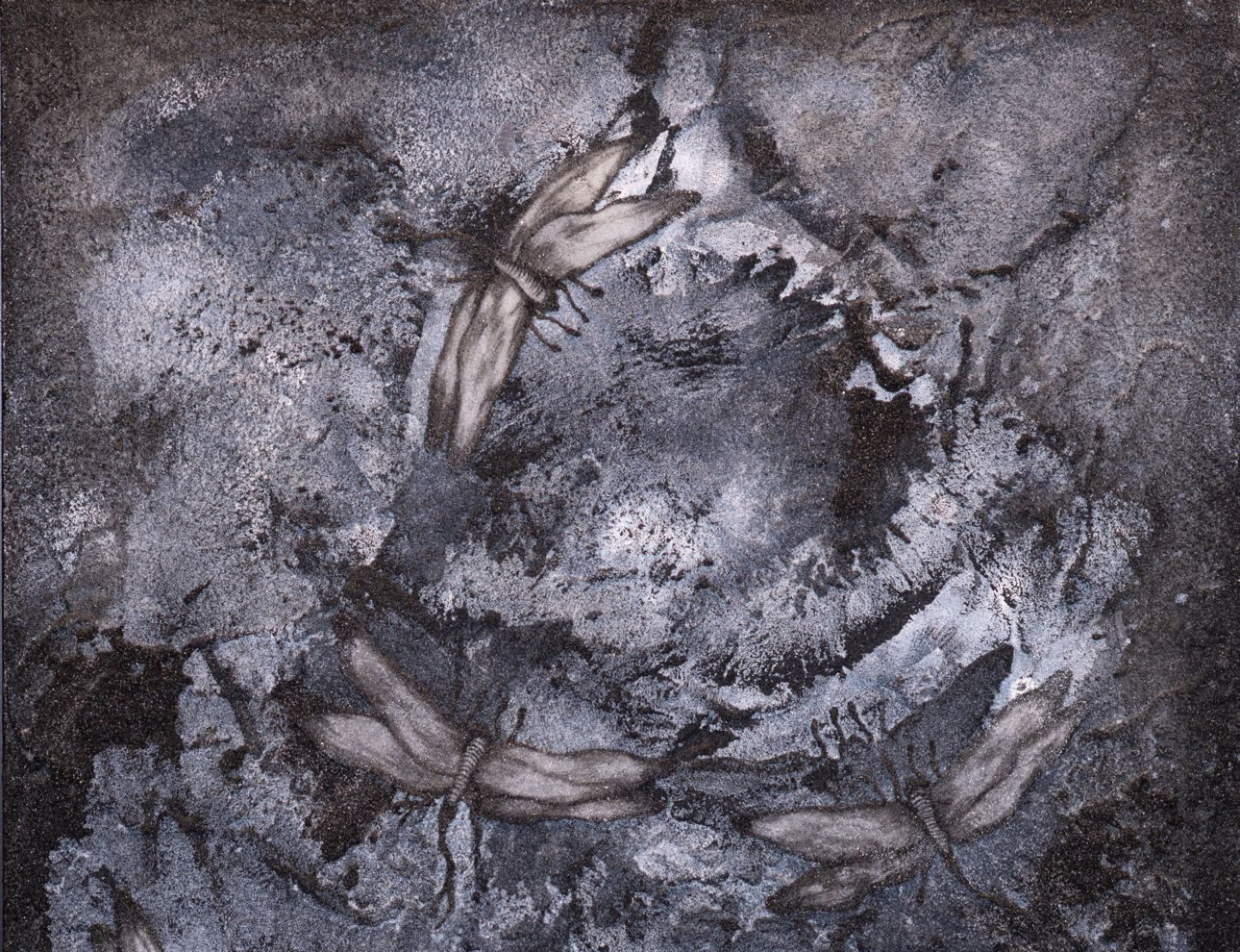 Bu sergi özelinde ise camın eritilmeden kullanım olanaklarını, akrilik, kağıt, toprak,kömür, toz boya ve bitkiler gibi ara malzeme yüzeylerinde denedim. Cam parçacıklarının ışığı taşıyışı, akrilikle ve diğer malzemelerle karıştığında oluşan yarı şeffaf macun, istediğim katmanları, yüzeyleri oluşturmamı sağladı.