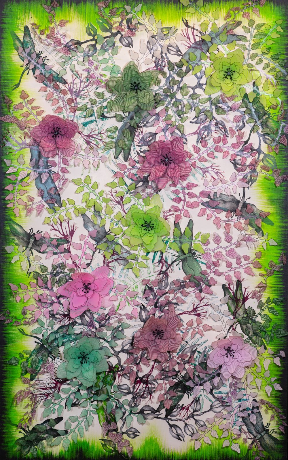Biz tanıştığımızda Elvan Alpay, 2018-19’da açtığı sergilerindeki malzemeden uzaklaşmaya çalışıyordu; yeni malzemelerle deneyler yapıyordu. Ama bunlar temel örüntülerle örtüşüyordu da: yani, kendini tekrar eden figürler ile, yoğun bir “yabani doğa”. Cam tozu ve akrilik kullanımına geçince, başka bir düzeye geçti bu figüratif dünya. Dolayısıyla bu dönemden itibaren, bence, Elvan Alpay, batı sanatının klasik mimesis sisteminden ayrıldı. Diyeceksiniz ki, zaten ayrılmıştı; evet, Pollock’la, Kosuth’la falan, ama “kavramsal” sanat dediğimiz dizgede, gördüğümüz iş neredeyse “siliniyor”, zihinsel bir görüntüyü ortaya koymak gerekiyordu. Zihinsel’i bilerek diyorum: Gördüğümüz “iş”, “eser” artık ne ad verirseniz verin, o şeyin “kendisi” bir “medium” haline gelmişti, zihinsel kurgumuz, işin önüne geçmeliydi. Alpay’daki kırılma bu değil. O mimesis düzeninin dışına çıktı bu işlerle, “kavramsal” da değil, e ne? Benim gördüğüm şuydu: Bu “işler” yüzeylerinde belirenlerin görülmesiyle değil, o da var tabii, ama daha ziyade, doğa dediğimiz biçim yaratıcı sürecin kendi işlerliğine kavuşmasıyla ortaya çıkıyordu. Ressam burada, bir “parça” idi. Yani işi üzerinde tahakküm kurmuyordu. Geriye çekiliyor, doğanın, en küçük parçasındaki, yani kuantum düzeyindeki işleyişini, yani belirsizliği (Heisenberg’in o çok sevilen ilkesi) öne çıkarıyordu.