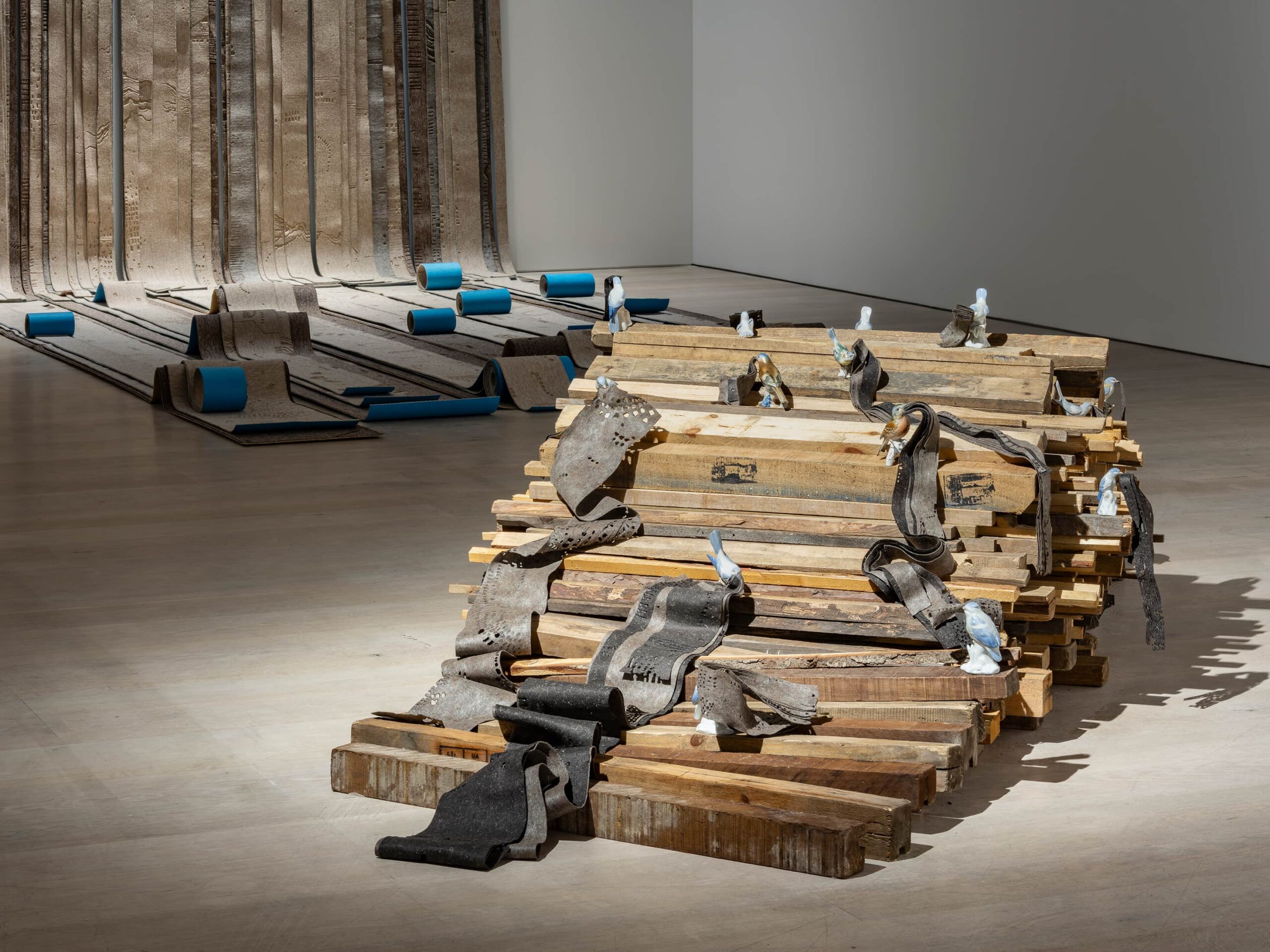Ateş Kuşları 2025 Porselen kuş figürinleri, jeotekstil keçe, ahşap Değişken boyutlar Green Art Gallery Dubai, Galerist ve sanatçının izniyle