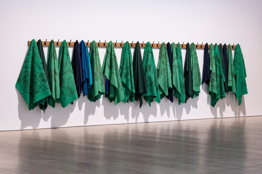 Kadim Bir Nehrin Mantosu, 2025. Kumaş üzerine grafit ile çizim ve frotaj, Değişken boyutlar ,Green Art Gallery Dubai,