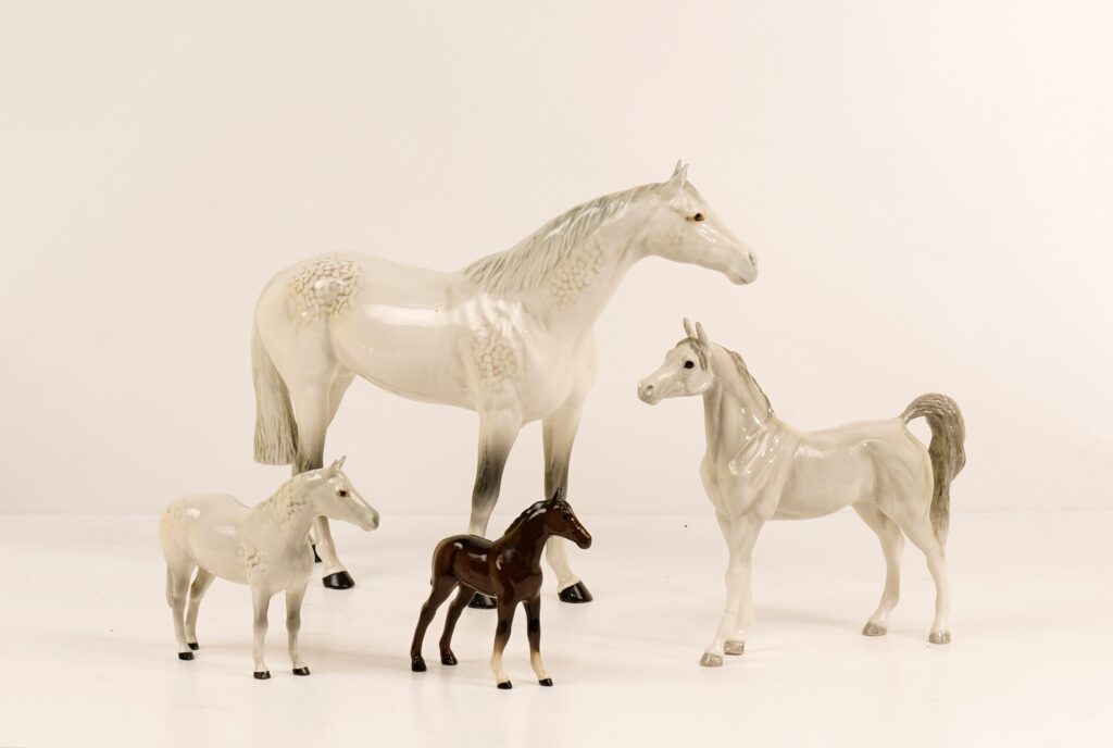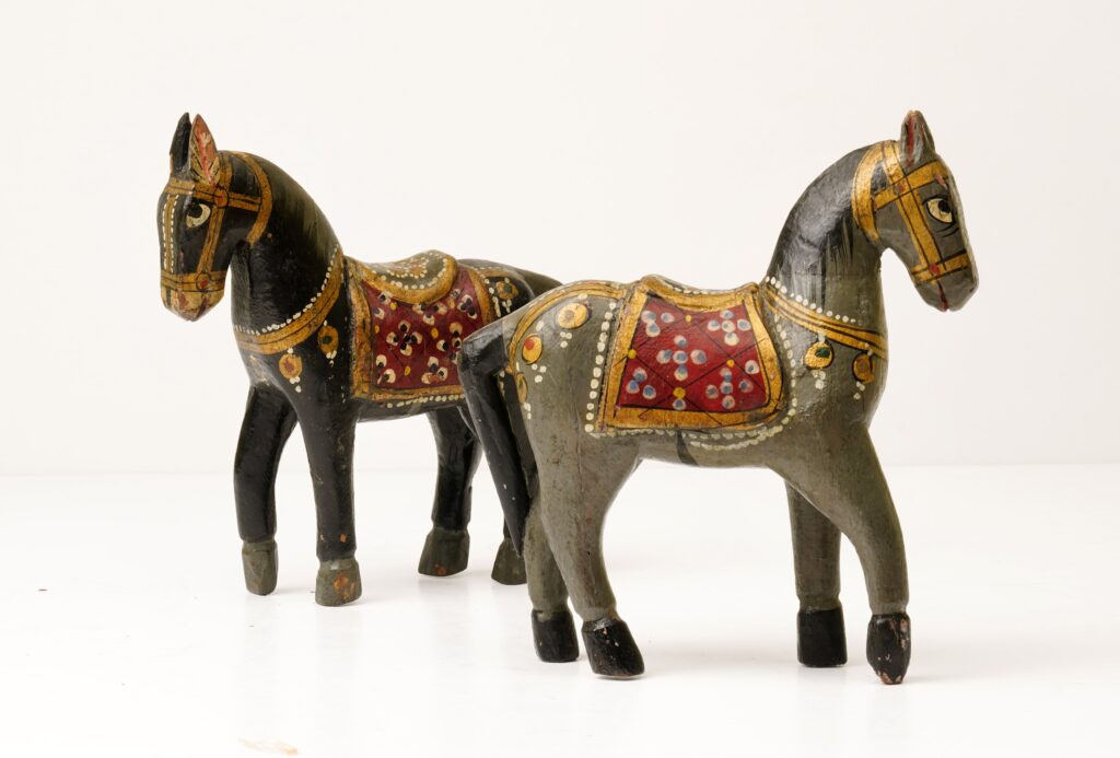 Antik Çin’de statü ve ruhani geçiş ritüellerinin bir parçası olarak üretilen pişmiş toprak “mingqi” atları, Tang Hanedanlığı’nın estetik mirasını yansıtan örnekleriyle koleksiyonda yer alıyor. Hint kültüründe kutsal kabul edilen at figürleri ise ahşap oyma tapınak heykellerinin renkli ve detaylı süslemeleriyle dikkat çekiyor. Avrupa porselen ve seramik geleneğini temsil eden 18. yüzyıl figürleri, hem dönemin sanatsal anlayışını hem de günlük hayatın estetik izlerini taşıyor.