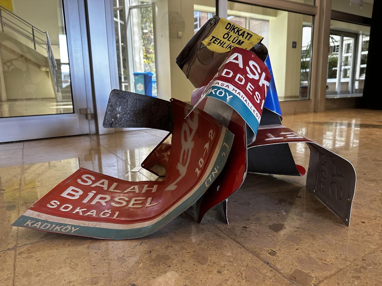 Barış Halit İpek, “Enkaz”, yerleştirme, buluntu sokak objeleri (uyarı levhası, araba plakaları, sokak tabelaları), 2025.
