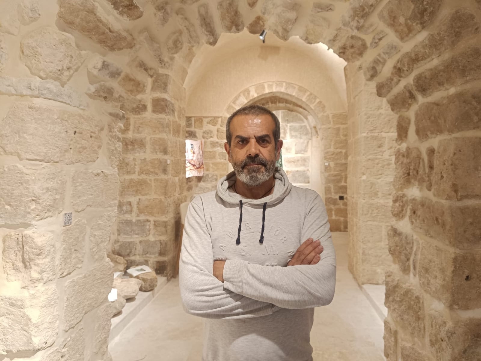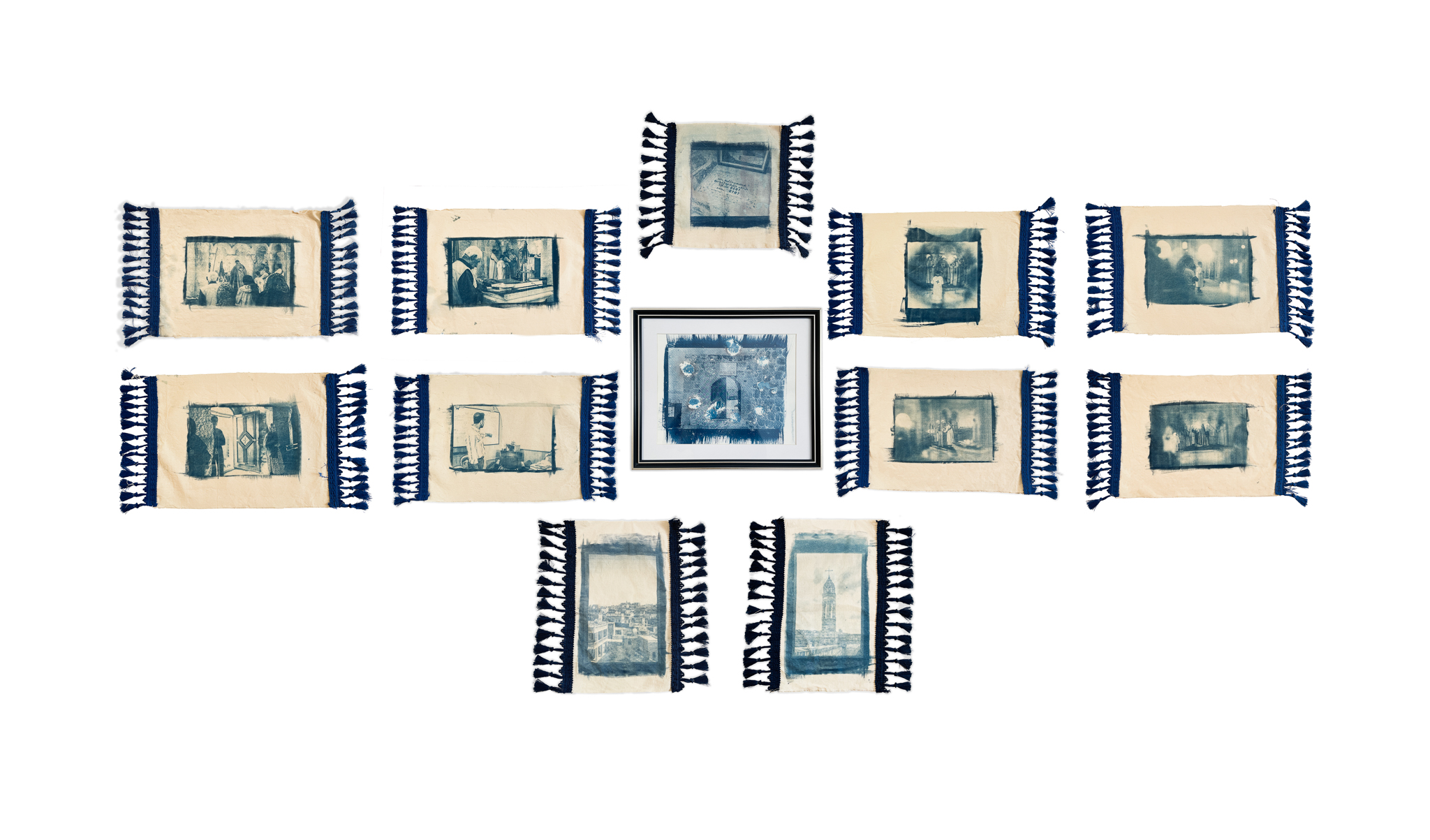Hüseyin Ulaş Akdemir, “Tur Abdin (Kullar Dağı)”, fotoğraf, kumaş ve suluboya kâğıdı üzerine cyanotype baskı, 41×34 (çerçeve), 30×44 (2 parça), 50×35 (8 parça), 36×36 cm, 2024.