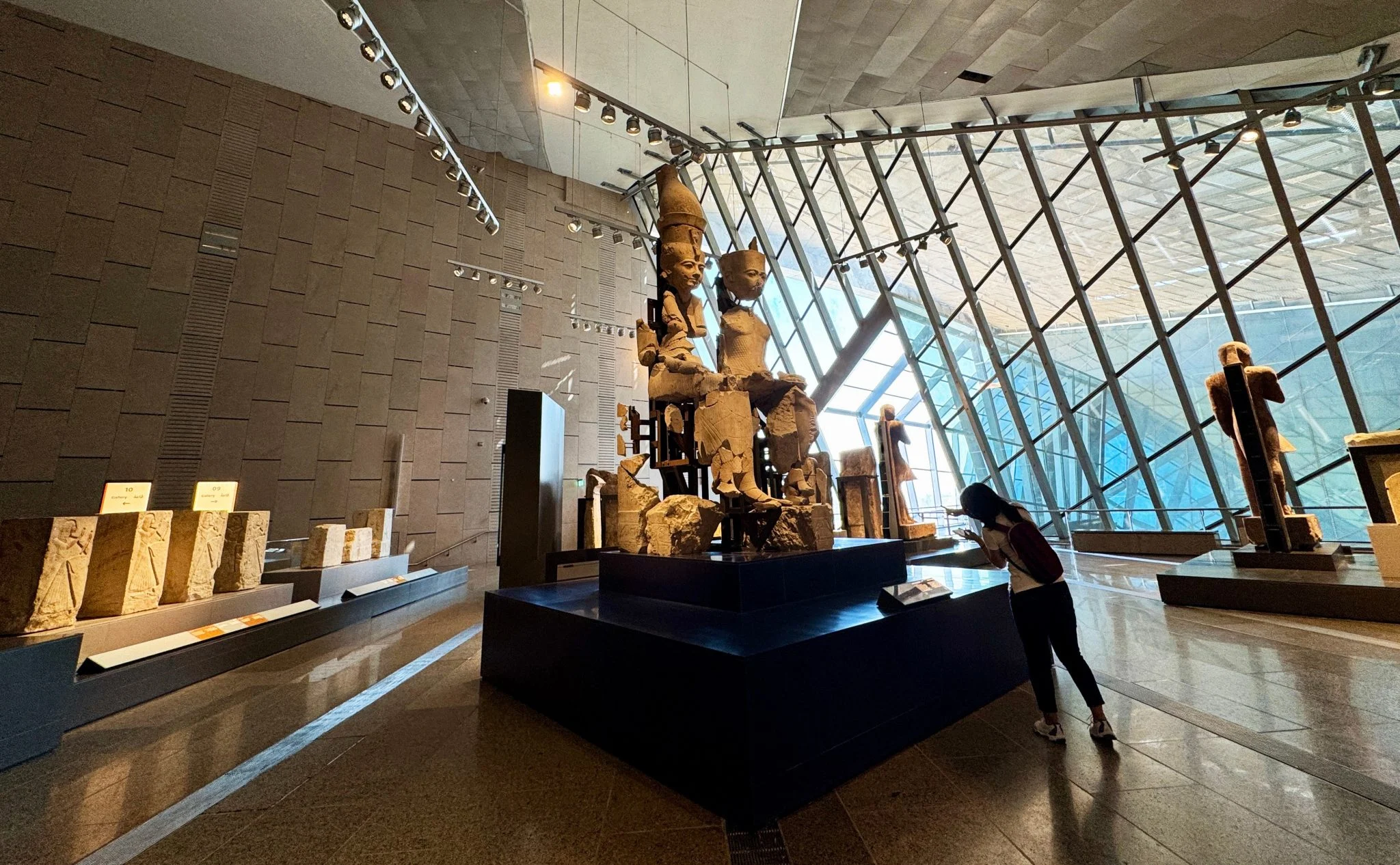 Dublin merkezli Heneghan Peng imzalı mimari proje, binayı Gize platosunun doğal yükseltisine yaslayarak ziyaretçiye geçmişe doğru bir tırmanış hissi veriyor. Girişteki devasa alan, alabaster taş kaplamasıyla antik ritüelleri anımsatıyor. Ancak bu büyüklük zaman zaman bir havaalanı atmosferi yaratacak kadar geniş; Ramses II’nin anıtsal heykeli bile bu dev hacim içinde sıradan bir parça gibi görünebiliyor.