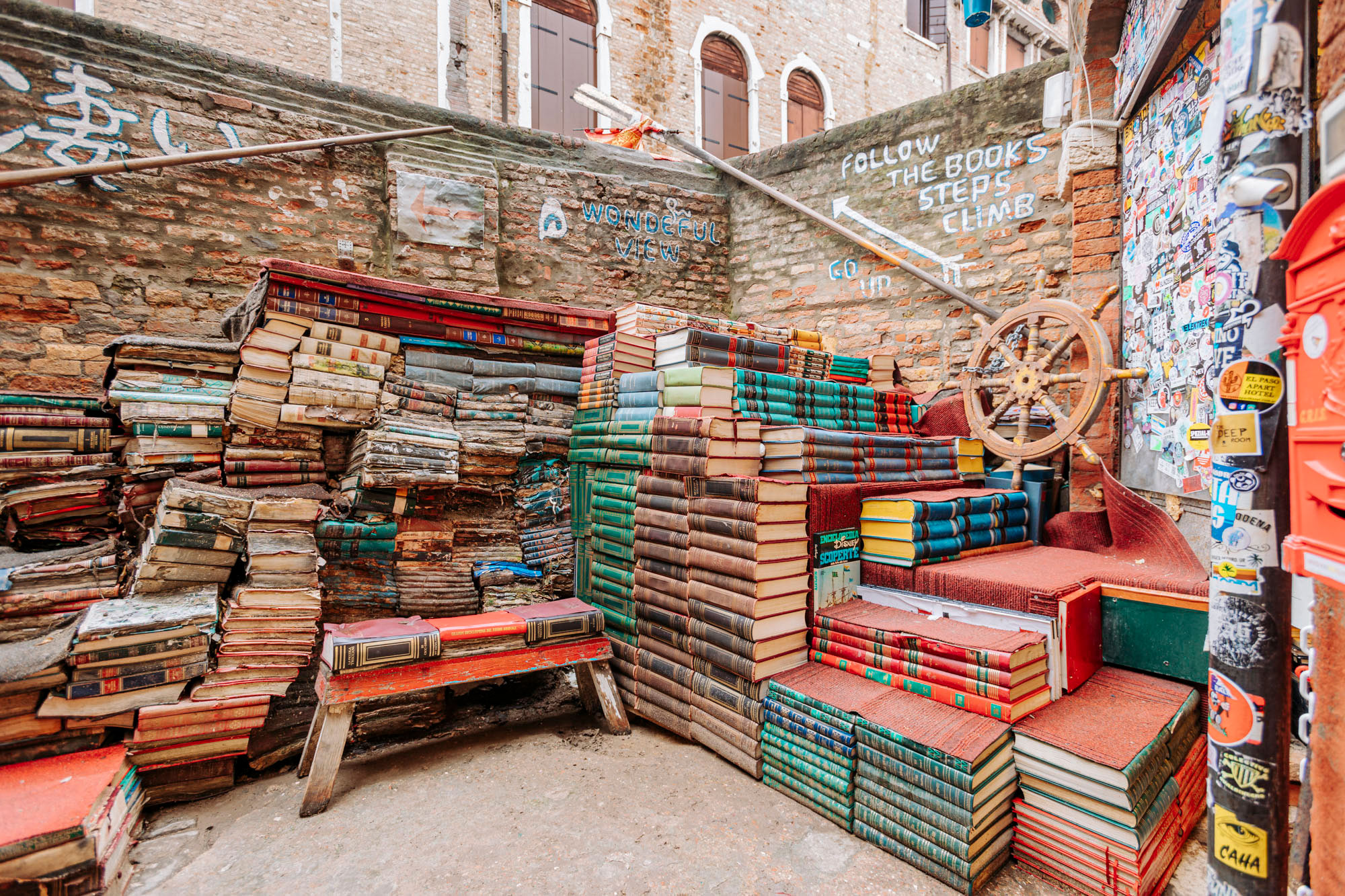 Venedik’te, yolların suyla kaplı olduğu bir şehirde kitap koleksiyonu tutmak zordur ama Libreria Acqua Alta bu sorunu yaratıcı bir şekilde çözüyor. Kitaplarını su geçirmez küvetlere, plastik kutulara ve hatta bir gondola yerleştirerek koruyorlar. Adı “Yüksek Su Kitabevi” olan bu mekan, duvarlara kadar dolu odalarında kitaplar, dergiler, haritalar ve çeşitli basılı materyallerle dolu büyüleyici bir atmosfer sunuyor. Venedik’in sık sık yaşadığı taşkınlarda su, mağazanın zemininden birkaç santimetre yükselebiliyor; ancak burada kitaplar bu sayede zarar görmüyor. Kitabevinin sıradışı atmosferi, yangın merdiveni yerine doğrudan kanala açılan bir kapı ve mağazanın kedileriyle tamamlanıyor.
