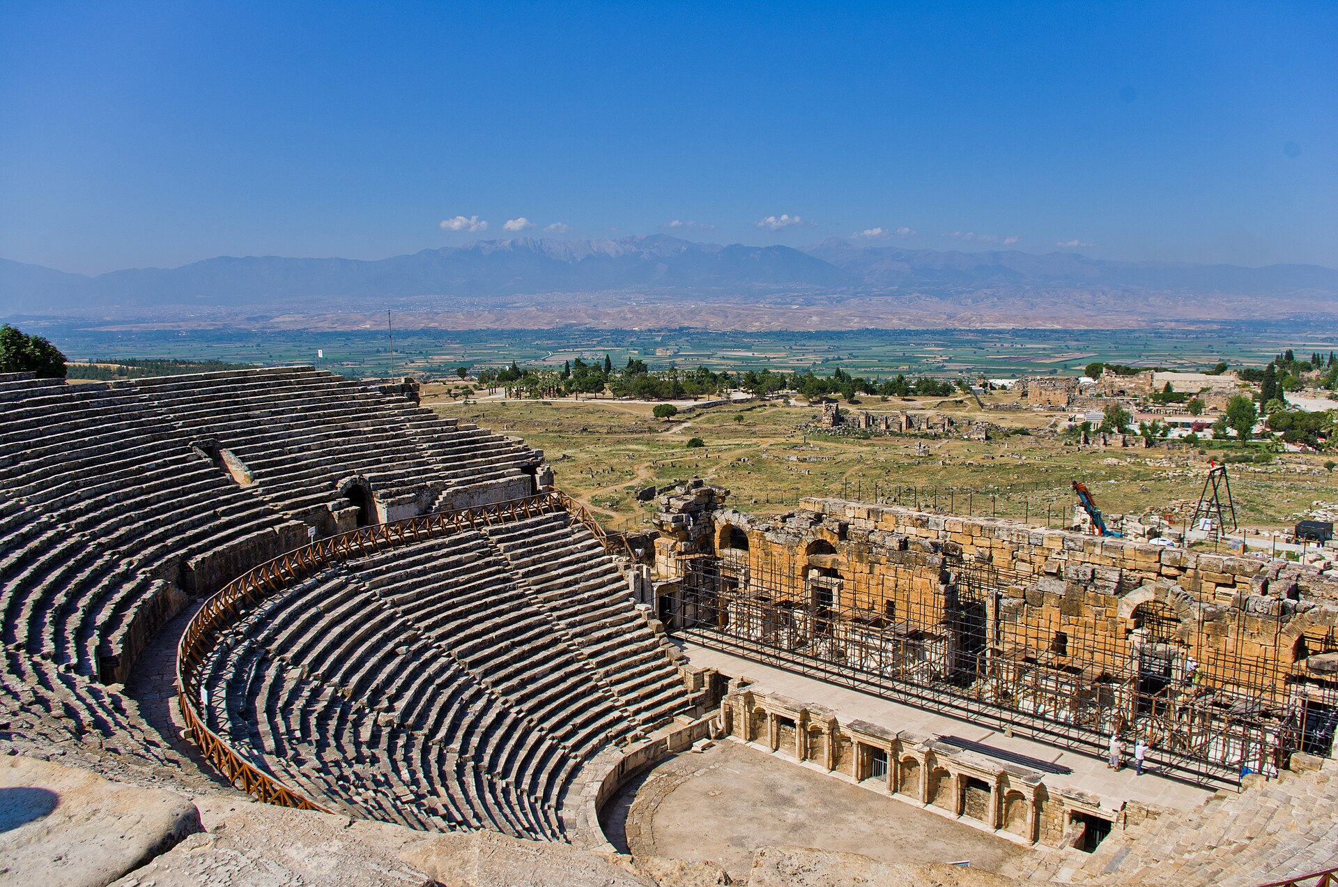 Seçkimizin Anadolu’daki önemli antik sahnelerinden biri, Pamukkale yakınlarında yer alan Hierapolis Antik Tiyatrosu. Kentin Roma dönemindeki yeniden yapılanma sürecinde inşa edilen tiyatronun yapımı MS 2. yüzyılda tamamlandı ve yaklaşık 9.500 kişilik bir kapasiteye sahip. Yamaca yaslanan cavea düzeni, mermer oturma sıraları ve mitolojik kabartmalarla süslü sahne binası yapının en dikkat çekici mimari unsurları arasında yer alıyor. Antik kaynaklar, tiyatronun sahne gösterilerinin yanı sıra gladyatör mücadelelerine de ev sahipliği yaptığını gösteriyor. Büyük ölçüde korunarak günümüze ulaşan yapı, Hierapolis antik kentinin en etkileyici kalıntılarından biri olarak varlığını sürdürmektedir.