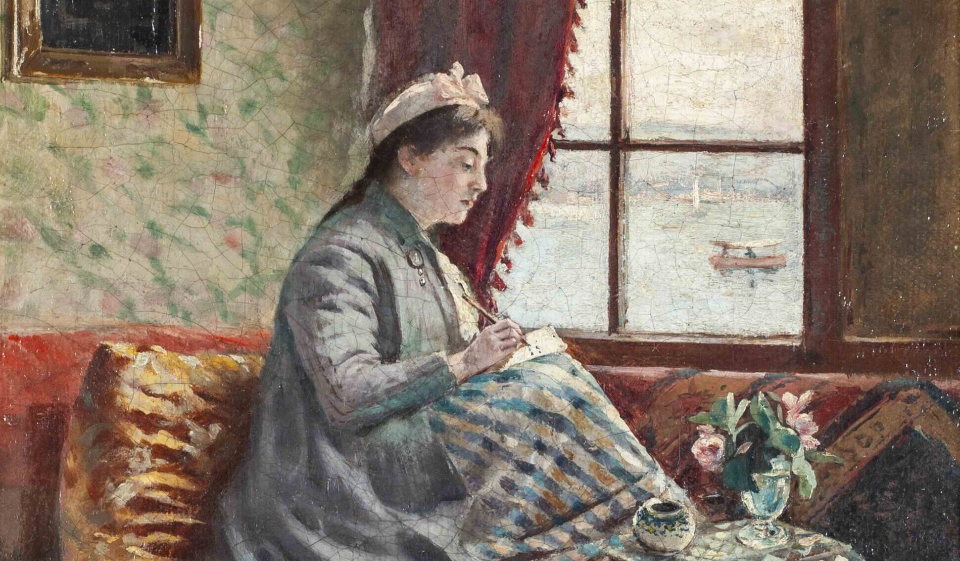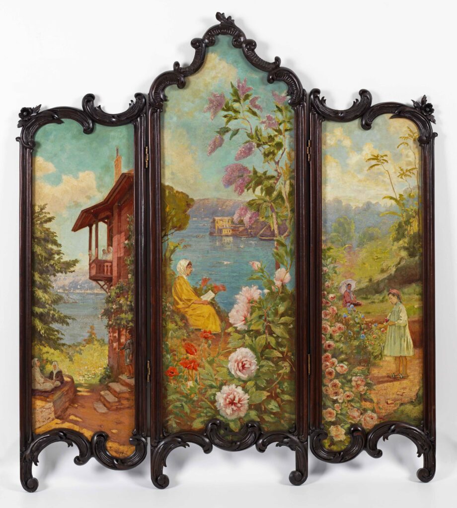 Meanwhile in the exhibition, the meticulous surprise prepared by Burçak Madran and the Tetrazon team makes it almost impossible not to linger for a long time before the Halil Paşa Studio section. This sense of surprise deepens further in the artist’s impressions of Bosphorus–Istanbul (1915), where the mirror he used while painting himself, or the spring branches embroidered onto a screen—woven with peonies, lilacs and poppies—appear alongside women, waterfront mansions and scenes filled with tranquility.