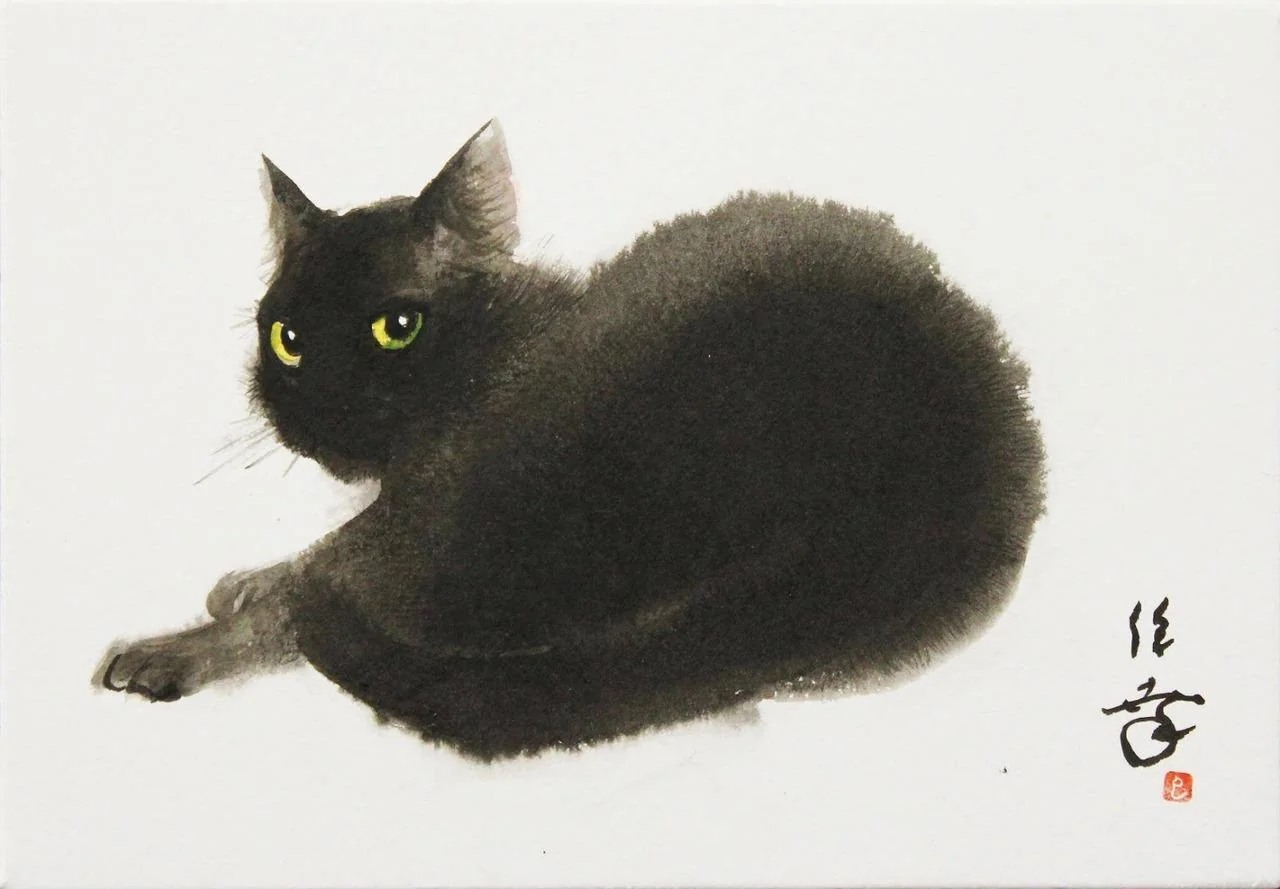 Enoki Toshiyuki’s Black Cat reflects on the layered meanings associated with black cats in Japanese visual culture. In Japan, unlike in medieval Western traditions where black cats were often linked with misfortune, they have frequently been associated with good luck and protective powers. Sources from the Edo period (1603–1868) record beliefs that black cats could bring fortune and ward off malevolent spirits. Some Edo-period folk beliefs also suggested that black cats could protect against illnesses such as tuberculosis. In this context, the presence of black cats was sometimes connected to ritual practices related to okyū (お灸), a traditional moxibustion-based treatment, where the animal’s presence was thought to bring healing and good fortune.