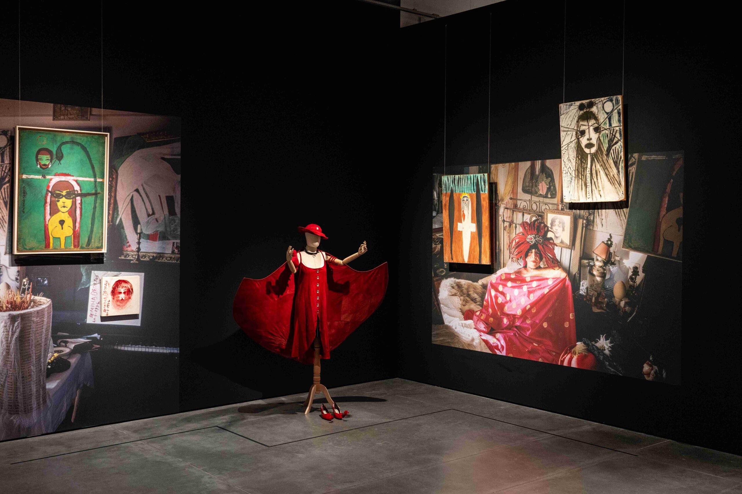 The exhibition invites viewers step by step into Berksoy’s life intertwined with the stage. At its heart, the Red Room focuses on her depictions of characters such as Tosca, Salome, and Fidelio, transforming into monumental narratives intertwined with her own body and identity.
