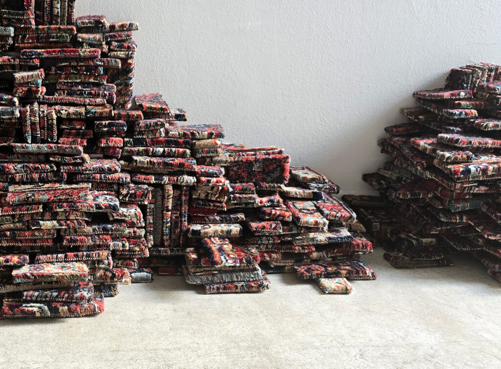 Şakir Gökçebağ’s work Teppiche (Carpets, 2011/25) focuses on the problem of harmony through artistic interventions in the familiar structure of carpets.