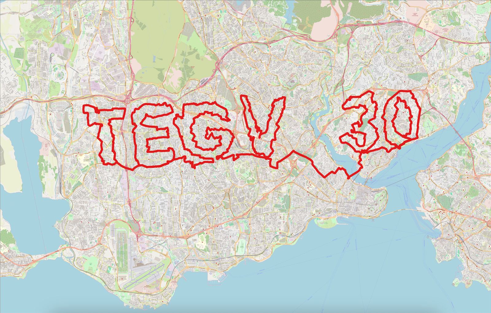 We studied maps for days to determine how to write “TEGV 30” across the city on foot, adhering to pedestrian rules. Among many alternatives, we chose the route that was both aesthetically pleasing and feasible. The route was ready, but running it was another challenge. Although the distance did not tire me compared to ultramarathons, overcoming obstacles, fences, slums, and highways was truly difficult. I must confess—I didn’t struggle this much even when running seven marathons on seven continents in seven days.