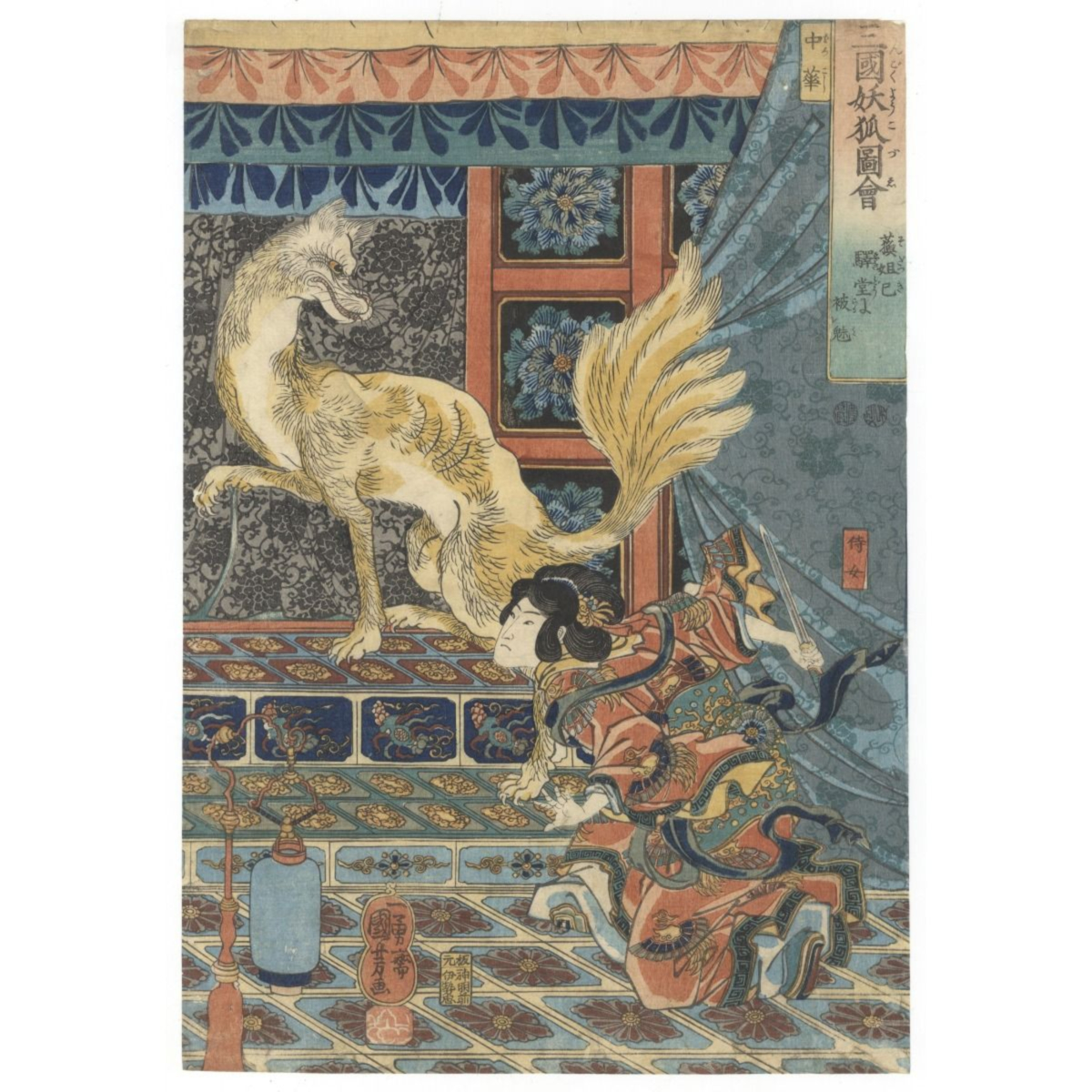 The Daji legend is considered one of the earliest examples in Chinese culture of the beautiful but bad woman. During the Song dynasty, the emperor banned fox-spirit cults associated with Daji. In Chinese art and opera there are scenes depicting Daji as a fox; in traditional paintings she sometimes appears with a fox tail behind her. In the 19th century, Japanese ukiyo-e artist Utagawa Kuniyoshi also portrayed Daji in nine tailed fox form. These images reflect a patriarchal fear within an Eastern context: a beautiful, magnetic woman is turned into a demonic being who brings down male power.