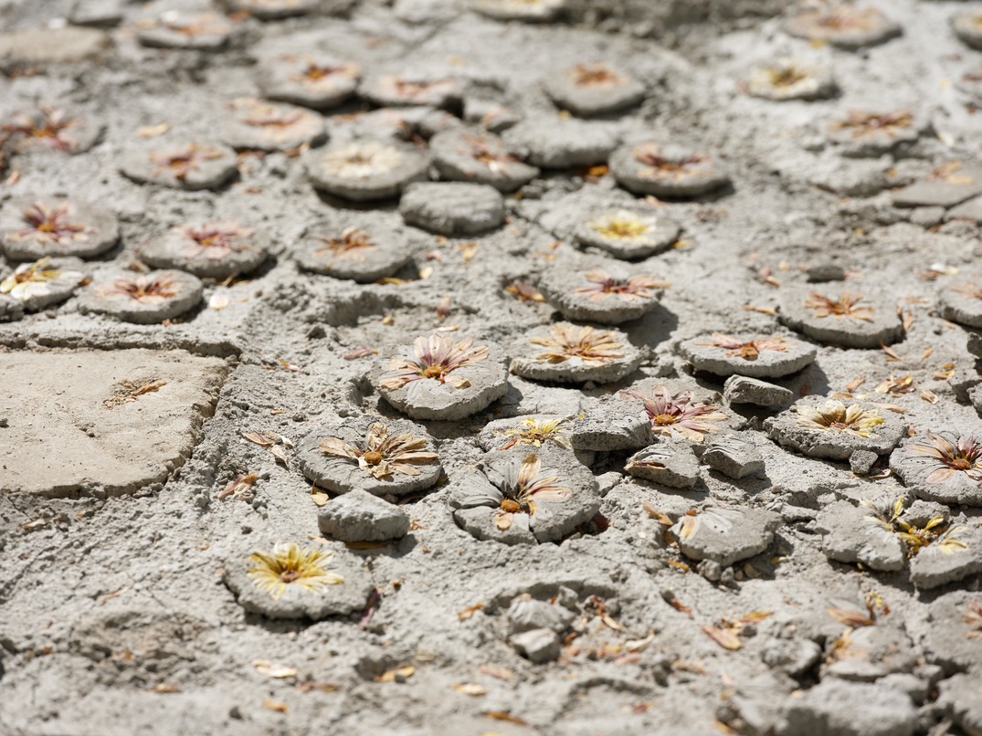 The emotional tone in Altıok’s poem is also subtle and profound. For this reason, we encounter different layers of meaning in each of the artist’s installations through her engagement with poetry. This relationship with poetic expression appears as a kind of evolution within her works. When we look at the two main patterns used in the exhibition—flowers embedded in concrete and window sills—we see that one of the reasons the flowers preserve their vitality is the water within the concrete, while the fractured surface of the sills once again brings us back to the notion of “bending.” Thus, we encounter an order within cycles once more. The artist reveals that a coarse material such as concrete is, in fact, filled with life and water; by contrast, the seemingly broken sills express the delicacy and subtlety of existence. In this way, the viewer embarks on a journey within the universe constructed by Eda Soylu—moving between below and above and from there toward the subtleties of cyclical discovery.