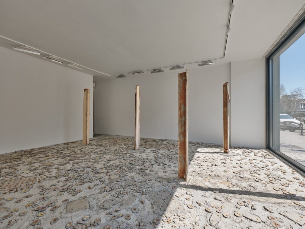 In the exhibition Upended at Merdiven Art Space, we may describe Soylu’s poetic inner world as merging with knowledge and poetry. Spanning two floors of the gallery, the installation greets the viewer with colorful flowers embedded in concrete, dispersed across the raw ground. This distribution is at once random and highly ordered, allowing the viewer to step onto the concrete flowers and, at times, break them—thus discovering new meanings within the installation. The flowers within the concrete evoke how a living entity may, over time, turn to dust, decay, and transform. In this way, we encounter the fragmented state of a whole. We witness the transformation of a universal meaning into a particular reality, while the singular retains its meaning as a single unit. Eda Soylu expresses this movement from the singular to the whole—or vice versa (from the whole to the singular)—within her newly conceptualized installation series. Thus, “Upended” appears as an installation series titled “And the Face of the House Bent.” The central idea presented by the artist in this context is not new; since 2012, Soylu has been working on the concepts of home and dwelling, and here she references her earlier installation, Rebuilding the House, realized in 2016 at Kadir Has University’s Galeri KHas.