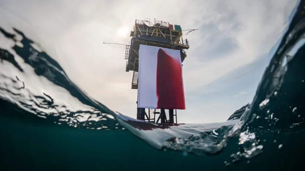 In August, however, the banner of climate protest was taken up by Anish Kapoor. In Butchered (2025), a performance staged in the North Sea by Greenpeace activists, a vast white canvas was unfurled from the top of an offshore gas platform, releasing one thousand liters of biodegradable, blood-red liquid. The resulting 96-meter crimson streak felt like the visual equivalent of a scream.