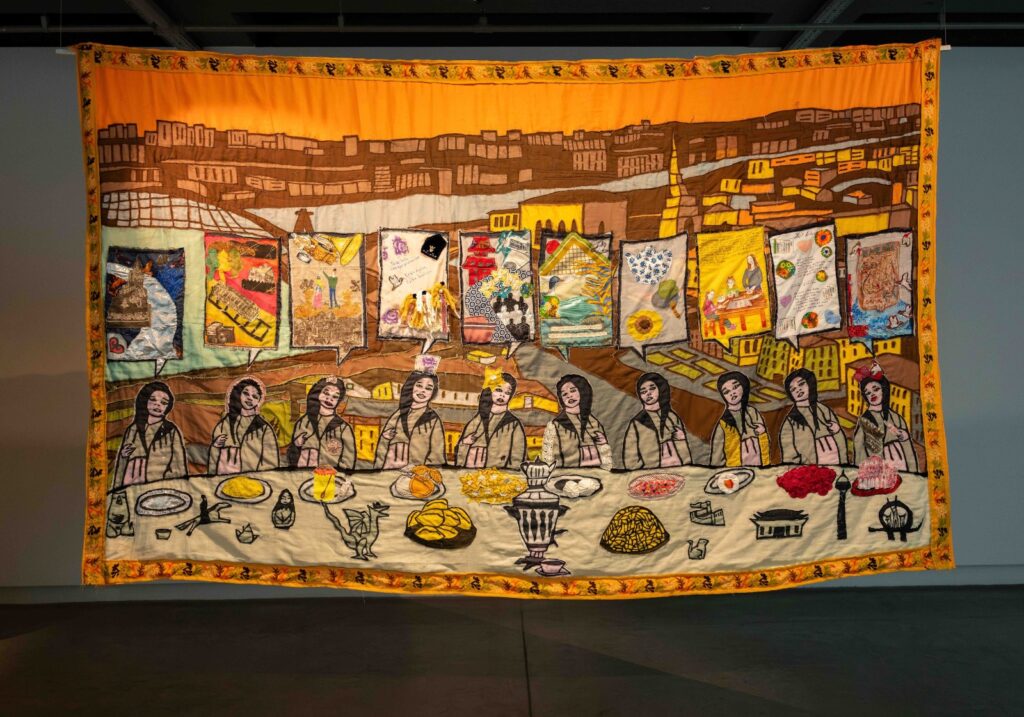 Serginin hazırlık sürecinde, Kazan’daki Tatar Kadınları Forumu’ndan Eskişehir’de düzenlenen Sabantuy Şenlikleri’ne uzanan bir dizi araştırma gezisi gerçekleştirildi. Bu buluşmalarda göç hikâyeleri dinlendi, video söyleşiler yapıldı, aile arşivlerinden çıkan fotoğraf albümleri ve yadigârlar kayıt altına alındı. Araştırmanın son ayağı ise Ankara’daki Kazan Kültür ve Yardımlaşma Derneği’nde, Çin’den Türkiye’ye göç etmiş Tatar kadınlarının katılımıyla düzenlenen dikiş atölyesi oldu. Atölye sürecinde paylaşılan kişisel anlatılar, eski Tatar şarkıları eşliğinde kumaşlara işlenerek kolektif bir pankarta dönüştü ve serginin merkezî unsurlarından biri hâline geldi.
