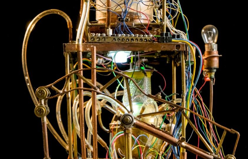 Elbette aslolan politik olarak nerede durduğu, hangi referanslara dayandığı ve külliyen ne söylediği. Punk’ın kendisi bir direniş kültürü ve bir politik bir duruş. Steampunk ve siberpunk da öyle; Bünyamin’in işlerinde teknoloji kullanımı sayesinde bu ikisine doğrudan referans vermek mümkün. Pırıl pırıl teknolojik cihazların, nano boyutlara inmiş devre elemanlarının, Yapay Zekâ’nın zamanında anakronik teknoloji kullanımı ile; bakır, pirinç gibi malzemeleriyle; çarklar, pistonlar, akışkanlarla kurduğu mekanik çözümleri ile steampunk; yine kullandığı eski —dolayısıyla— erişilebilir teknoloji ile, o teknolojiyi kullanarak ürettiği hikâyeler anlatan mekanizmalar ve anlattığı hikâyelerle, böceklerden insansı robotlara, “kendin yap” anlayışıyla ve düşük teknolojilerle yüksek teknolojilere yönelen kavramsal müdahalesiyle, siberpunk. Tümüyle distopik bir bilimkurgu; ama öte yandan da müdahale gücü ve cesareti ile, ayrıksı ve eğlenceli halleri ile, umut veren dünya hali.