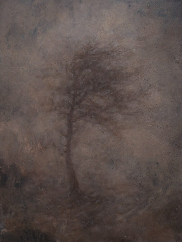 Resimlerde beden ile ağaç gövdesi, ten ile kabuk, meyvenin sulu içiyle gözyaşının tuzu birbirine karışıyor. Yaranın kabuğu meyvenin çekirdeğine dönüştüğünde ışık artık bir sızıntı olmaktan çıkıyor; maddenin içine çöken ağır bir sessizliğe dönüşüyor. Özbakır’ın tuvallerinde yüz, temsil alanı olmaktan uzaklaşarak zamanın katman katman biriktiği bir hafıza yüzeyine evriliyor.