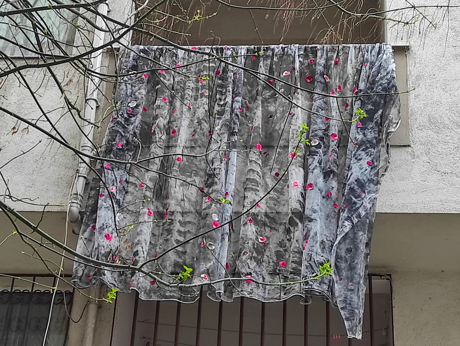 Sergi mekânının duvarları beton griye boyanarak dışarının içeriye taşındığı bir atmosfer yaratılıyor. Duvarlardan birine yerleştirilen balkon, içerisiyle dışarısı, mahremiyetle kamusal alan arasında salınan bir eşik olarak öne çıkıyor. Korkuluklardan sarkan güllü tül kumaş, geleneksel olarak bakışları engelleyen bir malzemenin burada iç mekânı görünür kılan bir araca dönüşmesiyle yeni bir anlam kazanıyor. Siyah ve gri tonlarına boyanmış bu kumaşlar, romantik bir motiften kayıp, şiddet ve bellek imgelerine evriliyor. Rose ve Kaybolan gibi işlerde güller, öldürülen kadınlara adanmış bir yas ve direniş işareti olarak beliriyor.