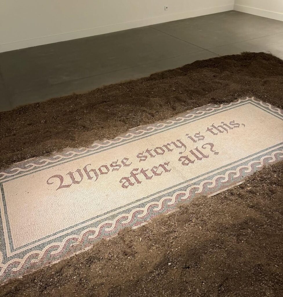 Esra Gülmen ve Cengiz Tekin’in Sonuçta Bu Kimin Hikâyesi? sergisi, toprağı hem hafıza alanı hem de tanık olarak ele alarak, göç ve kalış üzerinden kesişen yolları izleyiciye sunuyor. Mekânda mozaikler aracılığıyla parçalanmış ama canlı bir hafıza ortaya çıkarken, izleyici yalnızca bakmakla kalmayıp birlikte soru sormaya ve düşünmeye davet ediliyor.
