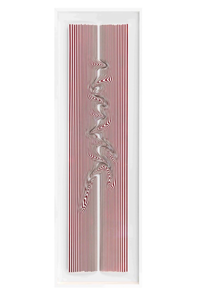 Seçkin Pirim’in kâğıt kesim heykelleri, tekrarlayan jestlere yönelik bilinçli müdahaleler üzerinden gelişerek simetrik katmanlardan heykelsi ve mimari formlara evriliyor. Gri Sütunlar ve Diken Bahçesi serilerinde antik mimarinin sütun formlarını çağdaş dijital müdahalelerle yeniden yorumlayan sanatçı, Perspektif adlı yapıtında ise bu araştırmayı güncel dijital estetikle genişletiyor. Pirim’in kâğıt yüzeylerden katman katman inşa edilen işleri, dijital olarak kurgulanmış olsalar da yoğun bir el emeğinin izlerini taşıyor.