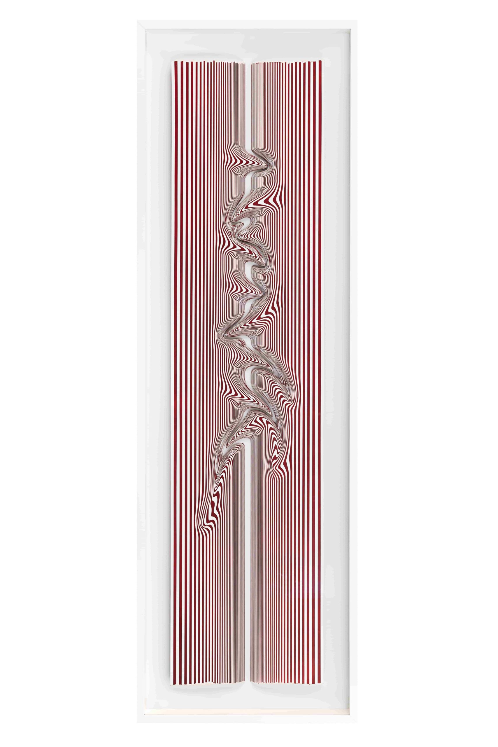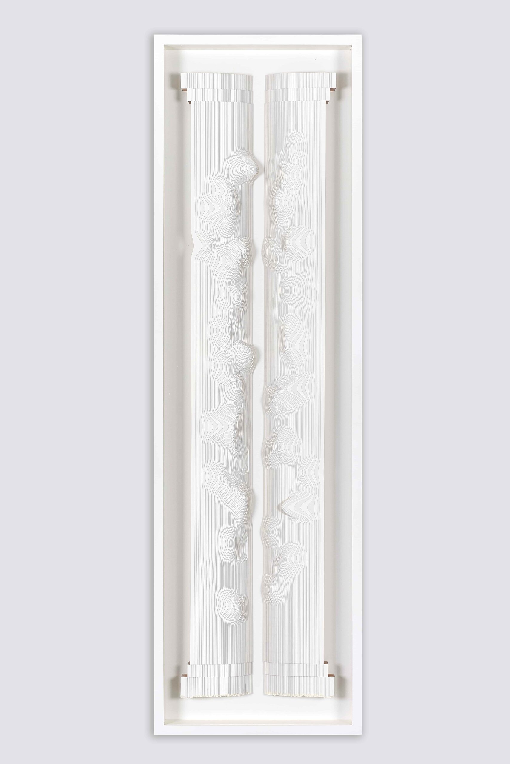 Seçkin Pirim’in kâğıt kesim heykelleri, tekrarlayan jestlere yönelik bilinçli müdahaleler üzerinden gelişerek simetrik katmanlardan heykelsi ve mimari formlara evriliyor. Gri Sütunlar ve Diken Bahçesi serilerinde antik mimarinin sütun formlarını çağdaş dijital müdahalelerle yeniden yorumlayan sanatçı, Perspektif adlı yapıtında ise bu araştırmayı güncel dijital estetikle genişletiyor. Pirim’in kâğıt yüzeylerden katman katman inşa edilen işleri, dijital olarak kurgulanmış olsalar da yoğun bir el emeğinin izlerini taşıyor.
