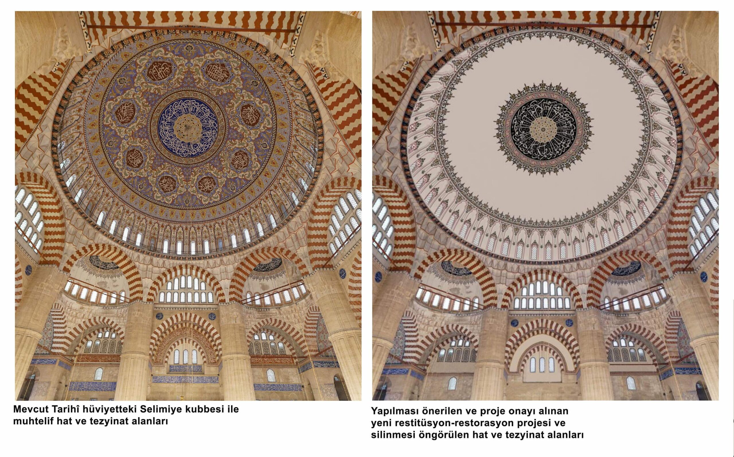 Çağdaş dünyada restorasyon, bilimsel bir etkinliktir ve uluslararası koruma ilkelerine göre yürütülür. Kültür varlığı yaşayan bir organizmadır; zaman içinde yapılan onarımlar sayesinde ayakta tutulur. Zamanla geçirdiği bu onarımlar, Selimiye Camii’nin geçmişinin bir parçasıdır ve tarihî belge değeri taşırlar. Caminin kubbesinde mevcut bezemeler, geç Osmanlı dönemi restorasyon çalışmalarına ait izlerdir ve yapıldıkları dönemin estetik anlayışını yansıtan, korunmaları gereken sanatsal katkılardır.