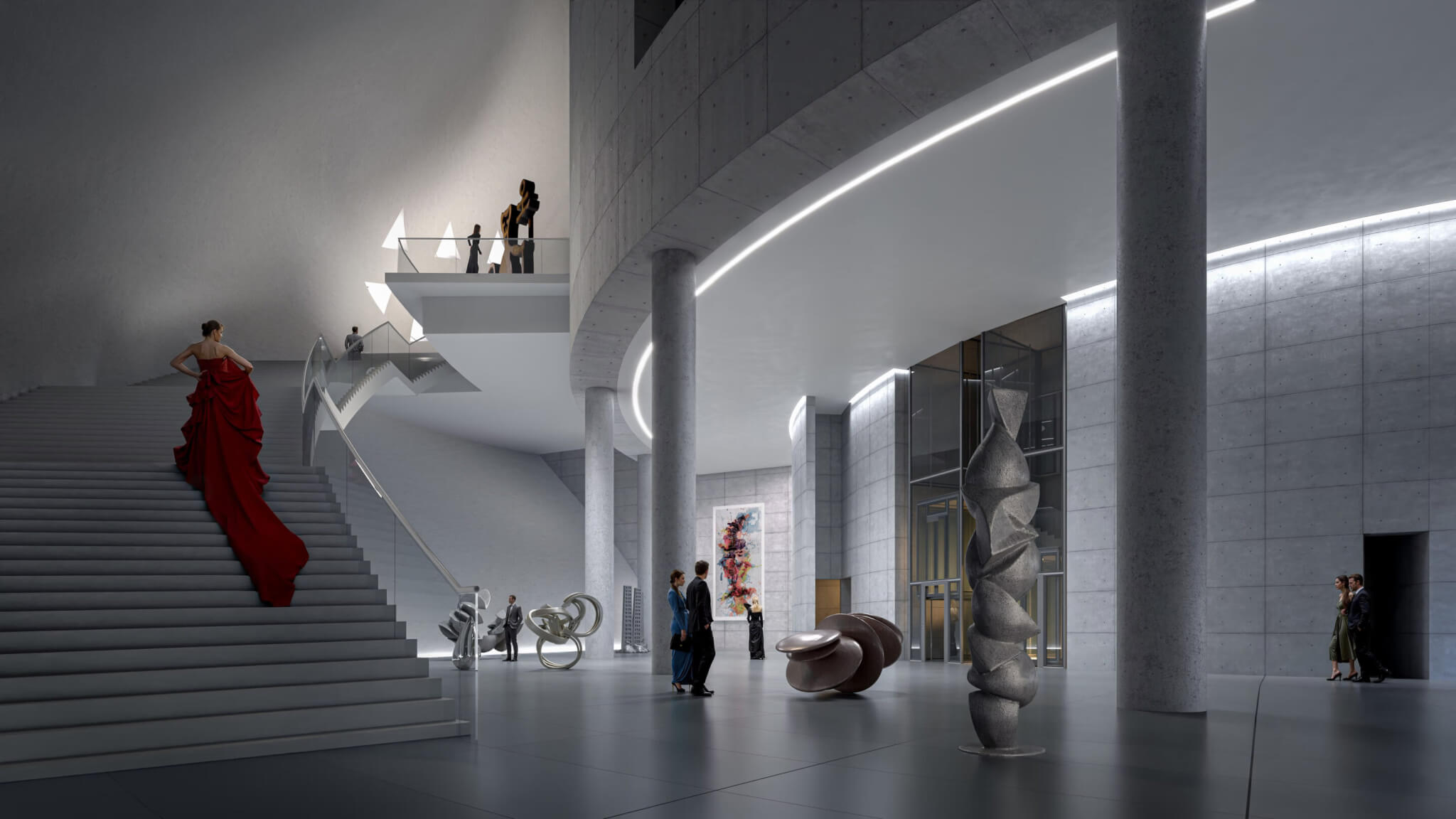 Zemin ve birinci katta yer alacak geniş galeri alanları, çağdaş sanatın farklı biçimlerini barındıracak şekilde esnek olarak planlandı. Müzenin üst katında yer alan VIP salonu ve restoran, tam cephe camlarıyla Dubai siluetine açılan panoramik bir teras sunacak. Ayrıca müze bünyesinde kütüphane, okuma salonları, araştırma birimleri ve genç sanatçılara yönelik atölye alanları da yer alacak.