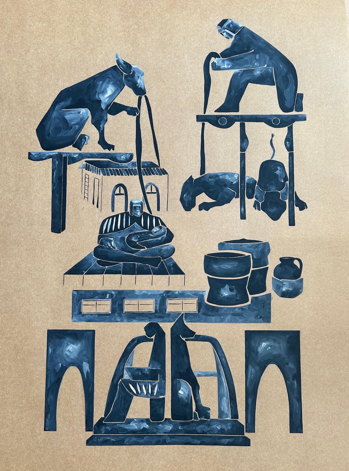 Eymen Aktel, Yağmursuz Toprakların Şenliği adlı ilk kişisel sergisinde insan ve hayvan figürlerinin iç içe geçtiği kompozisyonlar kurarak; insan-doğa ilişkisini kültürel, politik ve varoluşsal katmanlarıyla tartışmaya açıyor. Sanatçı, doğa ile toplum arasındaki geçirgen sınırları görünür kılarken izleyiciyi bu ilişkiler üzerine yeniden düşünmeye davet ediyor.