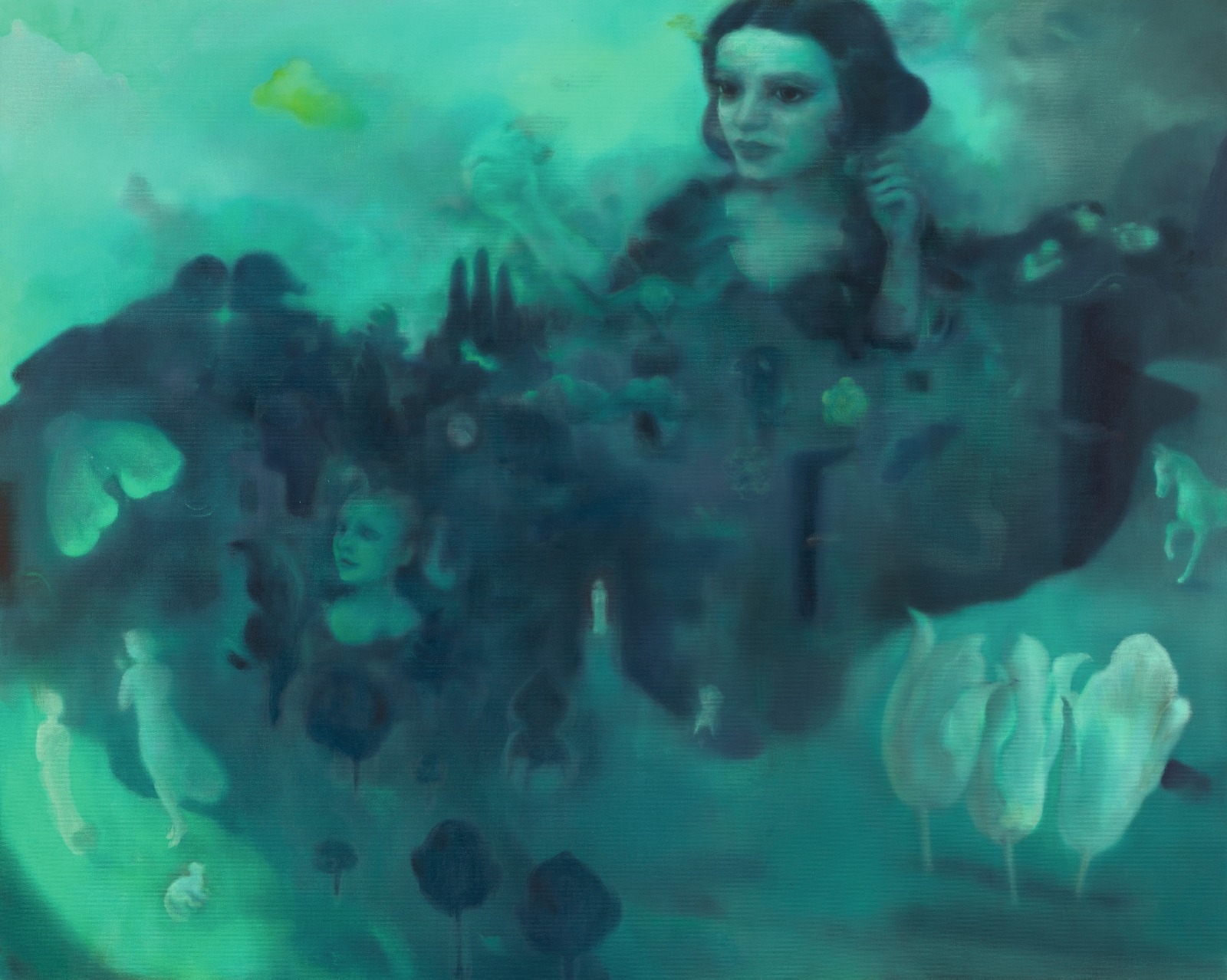 Saraçoğlu, Untold Tales’te üslubunu kavramsal ve biçimsel olarak yeni bir estetik eşikte yeniden konumlandırıyor. Önceki dönemlerinde geniş bir renk paletiyle çalışan sanatçı, bu seride bilinçli bir sadeleşmeye giderek belirli renklere odaklanıyor. Daha az renkle kurulan bu yeni ifade alanı, mavi-yeşil armoninin sarı ve morla eşlik ettiği buğulu imgeler aracılığıyla hafızaya yönelen bir anlatı geliştiriyor.